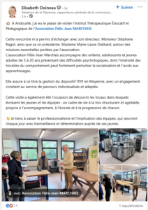 Visite de Mme DOINEAU Elisabeth à Andouillé Écrit le 9 avril 2026. Lien vers la publication : https://fr.linkedin.com/posts/elisabeth-doineau-1b7b07329_%C3%A0-andouill%C3%A9-jai-eu-le-plaisir-de-visiter-activity-7447886027735707649-masO « Précédent