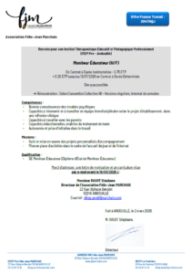 Offre emploi moniteur éducateur (H/F) – CDI 0.75 ETP Écrit le 3 mars 2026. L’association Félix-Jean Marchais recrute pour l’ITEP Pro : 260302_OffreEmploi_ME75_cdi_ipro « Précédent
