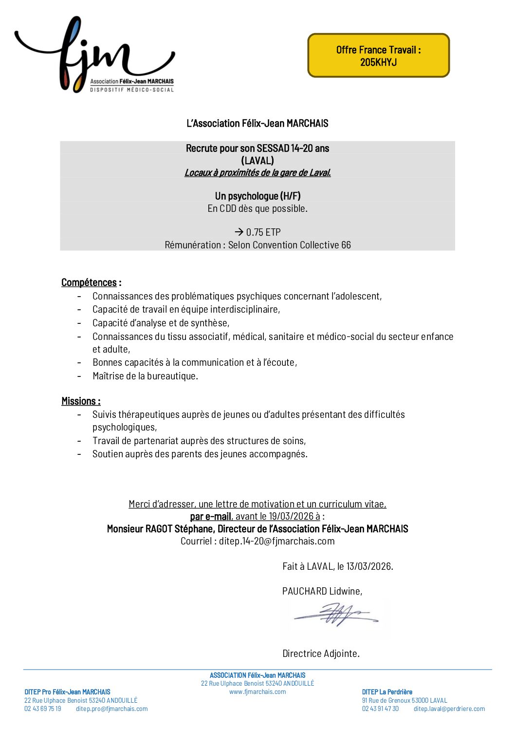 Offre emploi Psychologue (H/F) – CDD 0.75 ETP Écrit le 17 mars 2026. L’association Félix-Jean Marchais recrute pour le SESSAD 14-20 : 260313_OffrePsyRplcmtSESSAD1420 « Précédent